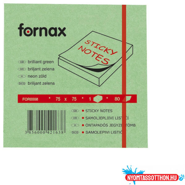 Jegyzettömb öntapadó, 75x75mm, 80lap, Fornax neon zöld Ideális rövid üzenetekhez, jegyzetekhez. Szinte minden felületen tapad és könnyen visszaszedhető. Feltűnő élénk színű, hogy ne vesszen el az információ.