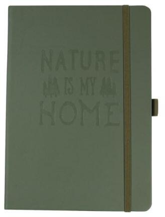 Kültéri jegyzetfüzet A5, négyzet. Vízálló borító design dombornyomással, 56 lap vízlepergető papír, 120 g/m2. Tollhurokkal, gumiszalaggal és archív zsebbel. Olíva színű.