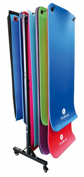 Gördítheto állvány felfüggesztheto fitness szonyegek tárolására. 4 db 34 cm hosszzú tartóval cca 40-60 dbb szonyeg egyideju tárolusura laklmas a ké toldalon elosztva. 190 cm magas állvány standard 60 cm széles szonyegekhez