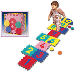 A készlet 16 elemet tartalmaz, ami segítségével egy ugróiskola forma is összeilleszthető. A szőnyeg 3 éves kortól ajánlott. Puha EVA hab anyag, formamide mentes, nagy sűrűségű, hosszan tartó, rugalmas. Alkalmazható: hálószobába, bölcsödébe, óvodába. Technikai paraméterek: Termék méretei: 30 x 30 x 1,4 cm EVA habból 16 elemes 3 éves kortól