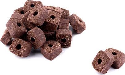 Összetétel:, kukoricaliszt, kukoricakeményítő, szorbitol, glicerin- növényi olaj, húsliszt 4%, borsó rost, DCH3743-16 komplett Premix (Ca, P, Na, Zn, kálium-szorbát (tartósítószer) Vitamin A 214.500 I. U. /kg, Vitamin D-3 11.700 I. U. /kg Vitamin E 1.250 mg/kg), aromaanyagok. Analitikai összetevők: nyersfehérje 4,89%, nyersrost 1,34%, nyersolajok – és zsírok 1,69%, nyershamu 4