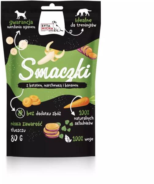 Vegetáriánus finomságok édesburgonyával, sárgarépával és banánnal A Syta Micha’s Vegán jutalomfalatok f riss zöldségekből és gyümölcsökből készülnek, és magas a tápértékük. A hús hiánya ellenére a természetes aromájuk jelentős, az egyedi íz pedig az édesburgonya, a lédús sárgarépa és az aromás banán kombinációjának köszönhető. Minden korosztályú k