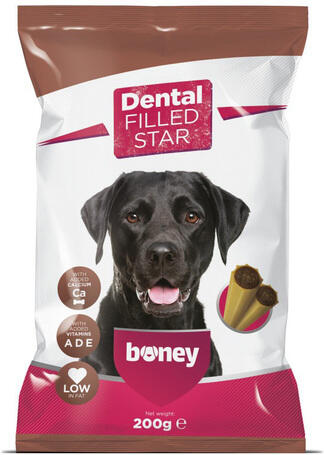 1kg Boney Dental Sticks Delta - Alacsony zsírtartalmú töltött rágórudak kutyáknak. A cikóriagyökér kivonat erősíti az immunrendszert és elősegíti a kalcium felszívódását, ami így erősíti a fogakat és a csontozatot.