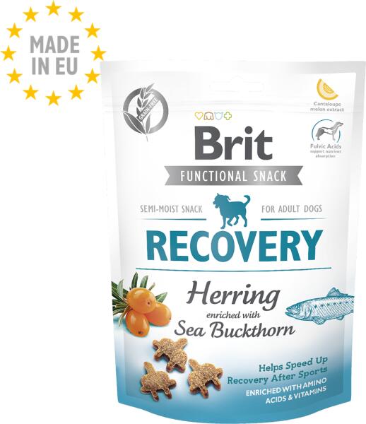 Brit Care Snack Dog Functional Recovery Herring – Funkcionális jutalomfalatok valamennyi felnőtt kutya számára, gabonafélék nélkül, regeneráló hatással. Összetevők: Szárított hering (26%), sütőtök (20%), vörös lencse (18%), növényi eredetű folyékony keményítő (14 %), hidrolizált hering fehérje (10%), hidrolizált hering lé (5 %), hidrolizált kollagén (4%), szárí