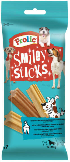 Frolic Smiley Sticks jutalomfalat kutyák számára 175 gA Frolic Smiley Sticks jutalomfalatot kapva kutyája nemcsak elégedett és jókedvű lesz, de egyúttal egészségesen jut rágcsálnivalóhoz. Segít megőrizni kedvencünk fogainak és fogínyének egészségét. A csomag 10 db 175g-os tasakot (tasakonként 7 rúddal) tartalmaz. Kistestű kutyáknak (pl. tacskó) 1 darab minden másnap. K
