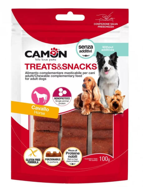 Monoproteines, ló ízesítésű adagolható snack. Nettó súly: 100 g. Adalék és gluténmentes értendkiegészítő kutyák számára. ÖSSZETÉTEL: lóhús 78%, állati melléktermékek (ló) 12%, szójafehérje koncentrátum, (növényi) glicerin, szorbit, nátrium-klorid - ANALITIKAI ÖSSZETEVŐK: Nyersfehérje 40,7% - Nyersrostok 1,2% - Nyerszsír 0,6% - Nyershamu 4,2% - Nedvesség 16,6%.