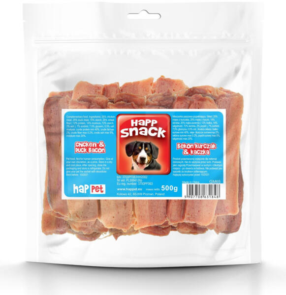 Nettó tömeg: 500g Összetevők: 25% csirkehús, 25% kacsahús, 15% keményítő, 20% búzaliszt (12% fehérje, 14% páratartalom, 72% keményítő, 2% hamu), 7% szorbit, 7, 5% glicerin, 0,5% só Analitikai összetétel: nyers fehérje min. 40%, nyers olajok és zsírok min. 2%, nyersrost max. 0,2%, nyers hamu max. 5%, nedvesség max. 20%. Mérete: 12 cm Csirke és kacsa szalonna Csirke és kacsa