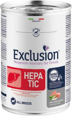 Sertés, rizs és borsó felhasználásával készült teljes értékű nedves eledel májbetegséggel küzdő kutyák részére.