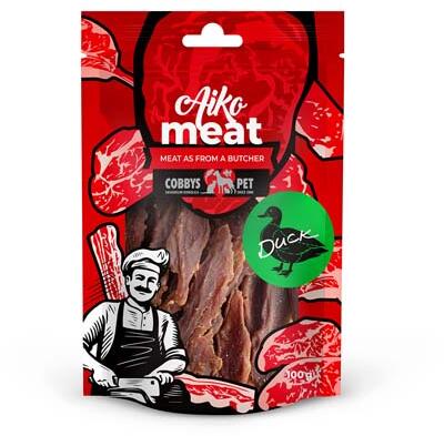 AIKO MEAT hús mint a hentestől- puha kacsahús szeletek. Kiegészítő eledel 6 hónaposnál idősebb kutyáknak, csemegeként. Összetevők: kacsahús 86%, borsófehérje 5%, burgonyakeményítő 3,5%, növényi glicerin 5%, só 0,5%. Analitikai összetevők: nyersfehérje 40%, nyersolajok és zsírok 2,5%, nyersrost 1,0%, nyershamu 5,5%, nedvesség 18%. Etetési utasítás: kutyájának napi 2