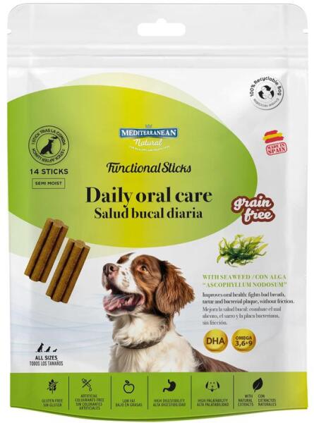 Mediterranean NaturalGabonamentes Funkcionális Jutalomfalatok a Megfelelő Szájápolás Támogatására (14 db/ csomag)Összetétel: 35% csirkehús, 20% pulykahús, növényi glicerin, csicseriborsó liszt, 10% serrano sonka, burgonyakeményítő, 4% ascophyllum nodosum (sárgásmoszatok), lazacolaj, szárított sárgarépa, napraforgóolaj, jukka kivonat, ásványi anyagok. Adalékanyagok: prop