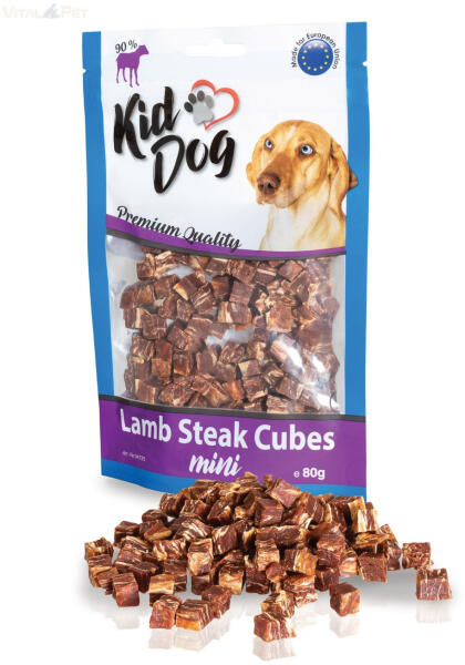 KidDog jutalomfalat kutyáknak - Mini Lamb Steak Cubes - mini bárány 95%, bivalybőr kockák 80g