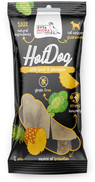 Kivételes csemegét keresel kedvencednek, ami nem csak finom, de egészséges is? Szeretnéd, hogy kutyusod étrendje a legjobb minőségű legyen? Kutyusod szereti az ínyenc falatokat?Próbáld ki az új Syta Micha Hot Dog fogtisztító rágcsát, marhahússal és ananásszal, mely nemcsak tökéletes nassolnivaló, hanem kutyusod napi étrendjének tökéletes kiegészítője is. Természetes