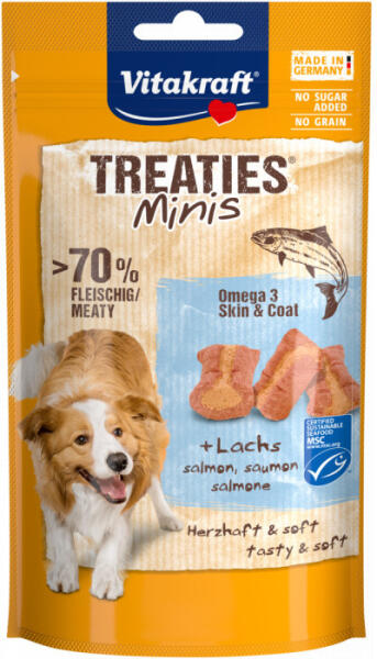 Az extra húsos Treaties® Mini-k különösen kicsik, így ideálisak tréningezéshez vagy kistestű kutyák kényeztetésére. Ízletes meglepetésként a töltött falatok finom lazacot tartalmaznak , és a bennük található természetes omega-3 zsírsavak is támogatják a szép szőrzetet. Nem csak ellenállhatatlanul finomak, de lédúsak is. Tökéletes jutalmazásra! Kiadós, húsos min