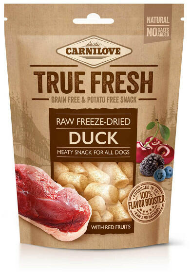 Carnilove fagyasztva szárított jutalomfalat kacsával és ötfajta piros gyümölccsel. Egyedülálló fagyasztva szárított falatok 90%-ban kacsahúsból. A kíméletes feldolgozási módszer megőrzi a hús eredeti ízét. Használhatók ízfokozóként a napi normál étkezés tetején, vagy ellenállhatatlan jutalomként. A piros gyümölcsök fokozzák a snack csodálatos ízét, és bizto