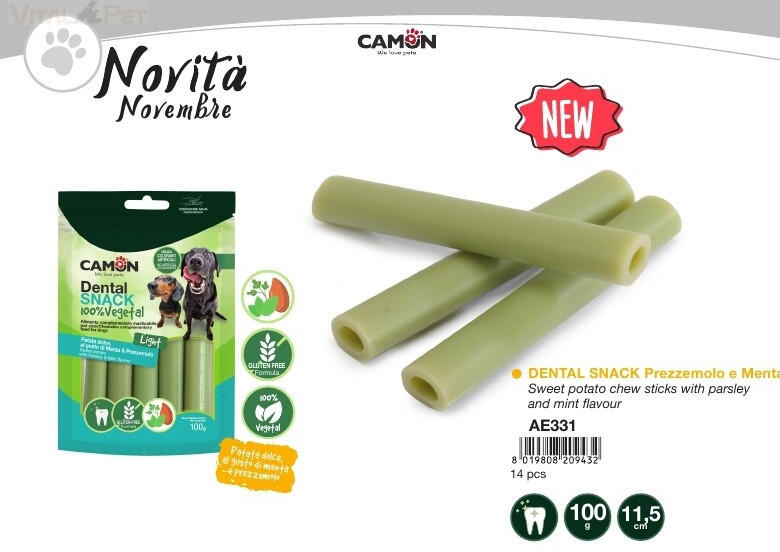 Dental snack petrezselyem és menta 100gramm /zacskó. Étrendkiegészítő jutalomfalat kutyák részére mesterséges színezék nélkül. Összetétel: édesburgonya 40%, előzselatinizált manióka keményítő, rizsliszt, glicerin, gyógynövények átalakításával nyert termékek (petrezselyem) 3%, menta 0,5%, nátrium-klorid. ADALÉKOK: tartósítószerek. ANALITIKAI összetevők: Nyersfe