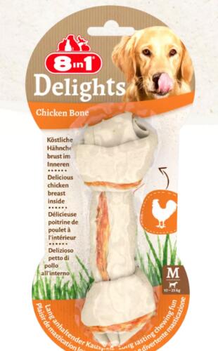 A 8in1 Delights közepes méretű (M), csirkéből készült rágócsontok ízletes marhabőrből és csirkemellből állnak és intenzív, hosszan tartó rágási élményt nyújtanak a közepes méretű, 10 és 25 kg közötti kutyák számára. Ami még fontosabb: míg az állat lefoglalja magát, a rágócsont ápolja a kutya fogazatát. A rágás természetes dörzsölő hatása miatt a rág