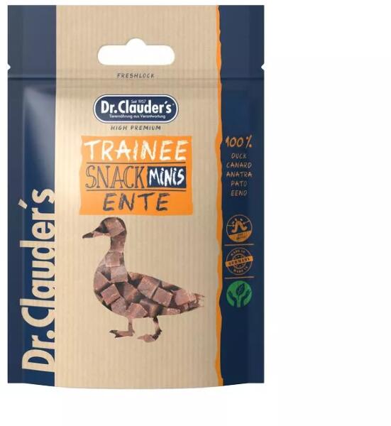 A Dr. Clauder s Trainee Snack Minis Duck 95%-ban finom kacsahúsból készült jutalomfalat. A kíméletes gőzszárítási eljárásnak köszönhetően a hús megőrzi egyedi ízét. Frukto-oligoszachariddal. Összetétel: kacsahús 95%, növényi melléktermékek, inulin (FOS) 0,5%, ásványi anyagok. Analitikai összetevők: nyersfehérje 39,0%, nyerszsír 12,5%, nyersrost 1,5%, nyershamu 5,5%,