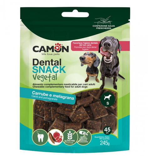 DentyVegs-szentjánoskenyér és gránátalma ízesítésű-S-es méretű, glutén és tartósítószermentes étrendkiegészítő felnőtt kutyák részére. Összetevők: rizsliszt, borsókeményítő, sörélesztő, tápióka keményítő, (növényi) glicerin, cellulózpor, kalcium-karbonát, szentjánoskenyér 2%, karamellizált cukor, friss gyümölcsök és zöldségek feldolgozásából sz
