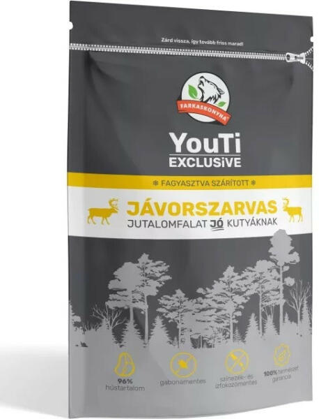 Fagyasztva szárított 100% jávorszarvas ból készült jutalomfalat kutyáknak 50 g fagyasztva szárított jutalomfalat ~ 150-200g hús felhasználásával készül. A jávorszarvas húsa mellett belsőséget is csempésztek bele, melyek értékes ásványi anyag forrásként is szolgálnak és még ellenállhatatlanabbá teszik ezt az igazán különleges jutalomfalatot. A fagyasztva szárítá