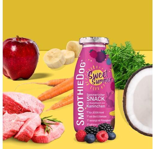 Robbanj bele a nyárba, az új Summer Edition nyúlhúsos smoothie-val. A nyúlhúsos smoothie kizárólag a feltüntetett összetevőket tartalmazza (még a húsleves is nyúlból készül) ezért tökéletes finomság érzékeny gyomrú, vagy allergiás kutyáknak is. A SmoothieDog nyúlhús menüje a legkiválóbb izomhúsból, zöldségekből, gyümölcsökből, gyógynövényekből készült