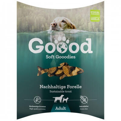 Puha jutalomfalat felnőtt kutyáknak. Puha jutalomfalat felnőtt kutyáknak. Jellemzők : Fenntartható pisztráng Kiváló minőségű fehérjével Nagyszerű a bőr és szőrzet számára Puha Gooodies jutalmfalataink hús vagy hal, bajor zöldségek és a Goood létfontosságú összetevőinek kiegyensúlyozott egyvelege. A csomagolás újrahasznosítható, a tartalom pedig 100%-ban klímaseml