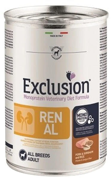 Az Exclusion Diet Renal Pork and Sorghum and Rice felnőtt ebek részére készült teljes, dietetikus élelem, veseműködés serkentő hatású krónikus vagy időszakos veseelégtelenség esetén. Ez a dietetikus élelem alacsony foszfor tartalmú és csökkent mennyiségben minőségi proteint tartalmaz. RENAL : étrendi támogatás krónikus vesebetegség, illetve átmeneti veseelégtelenség