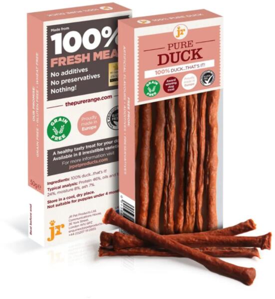 A JR Pet Product stick jutalomfalatok 100%-ban természetes összetevőket tartalmaznak. Gabona- és gluténmentes - nincs tartósítószer... egy csepp sem! Ideális minden fajtájú és méretű kutya számára. Ízletes és természetes, kutyusod biztosan nem tud majd ellenállni neki! A stick-ek 100%-ban friss, emberi fogyasztásra szánt színhúsból (monoprotein fehérjéből) készülnek