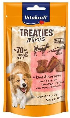 Az extra húsos Treaties® Mini-k különösen kicsik, így ideálisak tréningezéshez vagy kistestű kutyák kényeztetésére. A marhahússal és sárgarépával töltött finom falatok puha, húsos csemegék négylábú barátodnak. Ellenállhatatlanul finomak és különösen lédúsak . Tökéletes jutalmazásra! Kiadós, húsos mini falatok, tökéletes edzéshez Ideális kistestű kutyák
