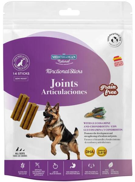 Mediterranean NaturalGabonamentes Funkcionális Jutalomfalatok Ízülete k Támogatására (14 db/ csomag)Összetétel: 25% pulykahús, 18% lazac, 18% tonhal, növényi glicerin, csicseriborsóliszt, 8% serrano sonka, burgonyakeményítő, szárított sárgarépa, glükózamin 3750mg/kg, kondroitin-szulfát 625mg/kg, napraforgóolaj, zöldajkú kagylóliszt 125mg/kg, jukka kivonat, ásványi anyag