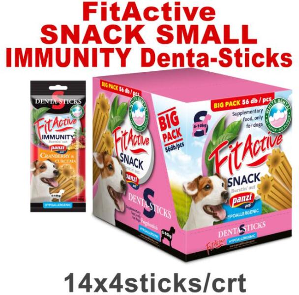 FitActive Denta-Sticks Hypoallergenic Immunity "S" - jutalomfalat (vörösáfonya, kurkuma) kutyák részére (14dbx140g/#) A Denta-Stick Cranberry rendszeres rágása - rágás általi fogtisztítás - csökkentheti kutyája fogkő lerakódásának mértékét. Fogváltás előtt álló kölyökkutyák számára nem ajánlott, 4 hónapnál fiatalabb kölyöknek nem adható.