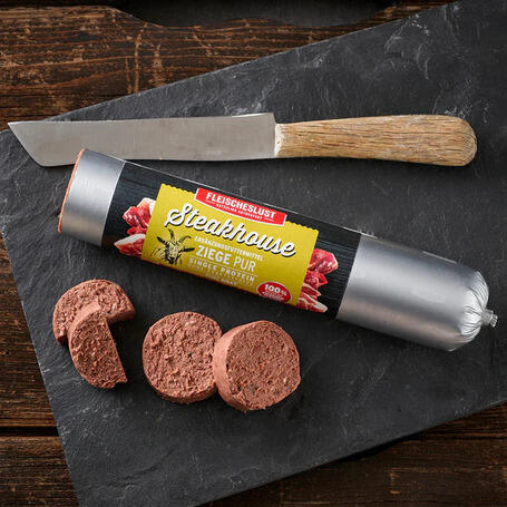 1.8kg Gluténmentes, alacsony hőmérsékleten, gőzölési eljárással készülő húsrolád antibiotikummentes húsokból. Egy féle állati fehérjét tartalmaz, szobahőmérsékleten tárolható, nyaralásokhoz is ideális. Csak kecskehús gégével, szívvel, májjal és tüdővel.