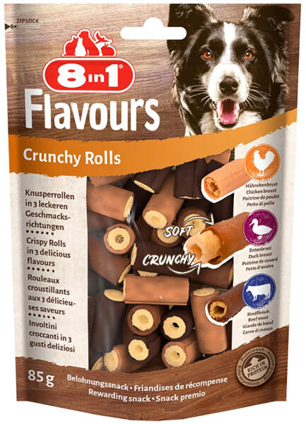 A zooplus. hu kínálatából: A 8in1 Flavours Crunchy Rolls ideális kutyasnack két étkezés között. A négylábú kis ínyencek nem szívesen hagyják ki ezeket a puha külsejük alatt ropogós tölteléket rejtő kis tekercseket. A kutyáknak szánt táplálékkiegészítő eledel gondosan feldolgozott, kiváló minőségű összetevőket tartalmaz, köztük ízletes húst többféle válto