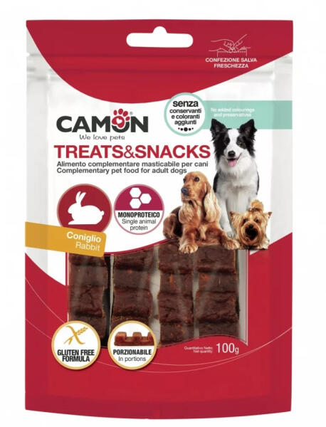 Monoproteines, nyúl ízesítésű adagolható snack. Nettó mennyiség: 100g. Étrendkiegészítő kutyák részére. Összetétel: nyúlhús 82%, szójafehérje koncentrátum, kukoricakeményítő, szorbit, (növényi) glicerin, nátrium-klorid. Analitikai összetevők: Nyersfehérje: 37,50% - Nyersrost: 0,7% - Nyerszsír: 4,7% - Nyershamu: 4,4% - Nedvesség: 23,6%. Használati útmutató: 6 hó