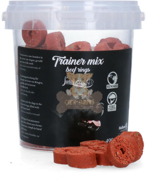 KÉPZÉSI/EDZÉSI JUTALOMFALAT MIX MARHAHÚS KARIKÁK, 400G Ezek a karikák finom marhahússal vannak töltve, és fél-nedves lágy jutalom a könnyű fogyaszthatóság érdekében. Ez azt jelenti, hogy ezek a falatok még mindig kissé nedvesek, és ezért rendkívül erőteljesek az ízük és az illatuk. Ezek a karikák ízletes finomságok kutyádnak, nem tartalmaznak hozzáadott cukrot, és