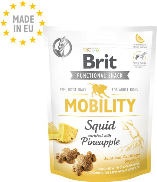Brit Care Snack Dog Functional Mobility Squid – Funkcionális jutalomfalatok felnőtt kutyák számára gabonafélék nélkül, támogatja az ízületek és porcok egészségét Ősszetevői: Szárított tintahal (26%), sütőtök (20%), vörös lencse (15%), növényi eredetű folyékony keményítő (14%), hidrolizált tintahal fehérje (10%), hidrolizált lazac lé (5%), hidrolizált kollagé
