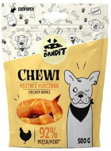Mr. Bandit CHEWI csirke és kacsa 500gMr. Bandit húsos falat az édes bajkeverőnek! Veszélyesen finom, minden kisállat szívét elrabolja! LeírásA rendkívül ízletes rágcsálnivaló sokáig lefoglalja a csibész kutyát. A finom csirkemellhúsba csomagolt aromás marhabőr tökéletes kombináció. ÖsszetételMarhahús nyersbőr 50%, csirkemell 42%, glicerin, burgonyakeményítő, Adalé