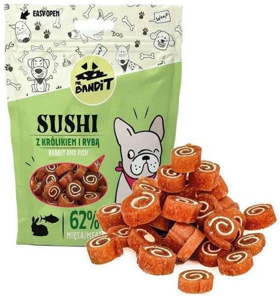 Mr. Bandit SUSHI nyúl és hal Mr. Bandit húsos falat az édes bajkeverőnek! Veszélyesen finom, minden kisállat szívét elrabolja! LeírásA kultikus rágcsálnivaló a finom nyúlhúst és az aromás tőkehalat ötvözi. Az apró, puha falat tökéletes motiváló és jutalom a gonosz trükkök megtanulásakor. ÖsszetételTáplálási ajánlásÖsszetételcsirkemell 39,5%, nyúl 22,5%, tők