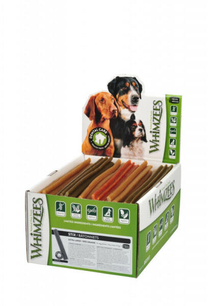 Whimzees Stix XL - 30db/kínáló kartonA WHIMZEES termékeket úgy fejlesztették ki, hogy segítsenek a kutyák fogait tisztán tartani. A Whimzees segít eltávolítani a plakkot és a fogkövet, csökkenti a rossz leheletet okozó baktériumokat. A termékek természetes összetevőket tartalmaznak, ez azt jelenti, nem tartalmaznak mesterséges összetevőket, tartósítószereket, ízfokozók