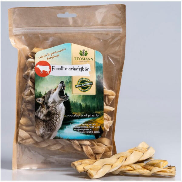 A marhafejbőr egy ízletes ehető fogkefe, ami tisztítja a fogakat és erősíti a rágóizmokat. Ízletes, tápláló, könnyen emészthető. 100%-ban természetes, színezékek és tartósítószerek hozzáadása nélkül. Összetevők: Nyersfehérje: 7%, Nyerszsír: 5%, Nyershamu: 16,9%, Nedvesség: 16%