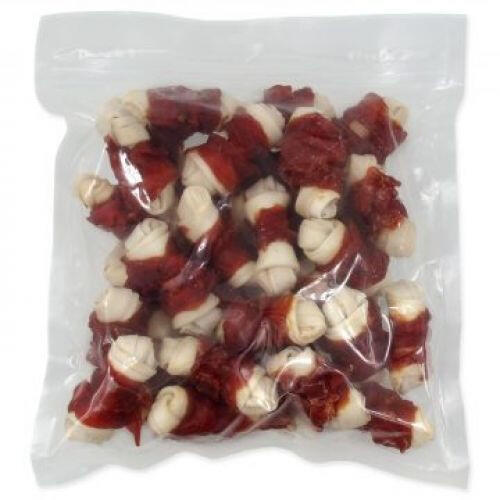 Bivalybőr csomóra tekert kacsahús- jutalomfalat felnőtt kutyák részére. Méret: 5 cm. Etetési utasítások: jutalomként a fajta mérete, aktivitása szerint. Összetétel: 70% nyers bőr, 30% kacsahús. Minőségi jellemzők: 60% nyers fehérje, 18% páratartalom, olajok és zsírok 4%, hamu 3,5%, rost 1%.