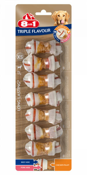Az 8in1 Triple Flavour ízletes rágócsontok sertés- és szarvasmarhabőrből, csirkefilével töltve készülnek, kellemes elfoglaltságot nyújtva kutyájának. Hosszan tartó rágási élményt biztosítanak a lepedék és a fogkő megelőzése érdekében. Jellemzők :- Ízletes húsos rágócsontok felnőtt kutyáknak. - A hosszan tartó rágcsálás élvezetes elfoglaltságot biztosít kut