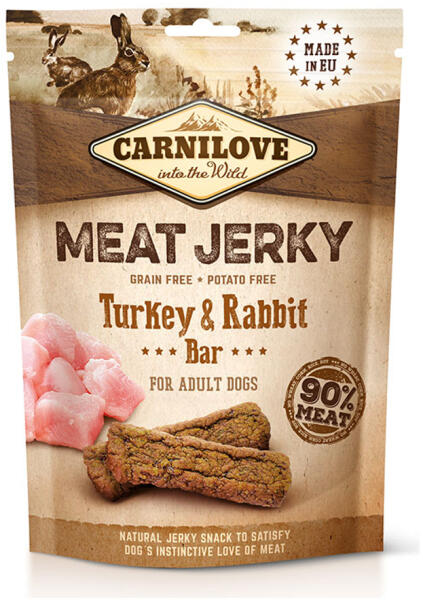A CARNILOVE Jerky Snack pulyka nyúl további jellemzői: 90% hústartalom Ellenállhatatlan íz Csak természetes antioxidánsok Gabonamentes, színezékmentes, cukormentes, GMO-mentes EU-ban készült