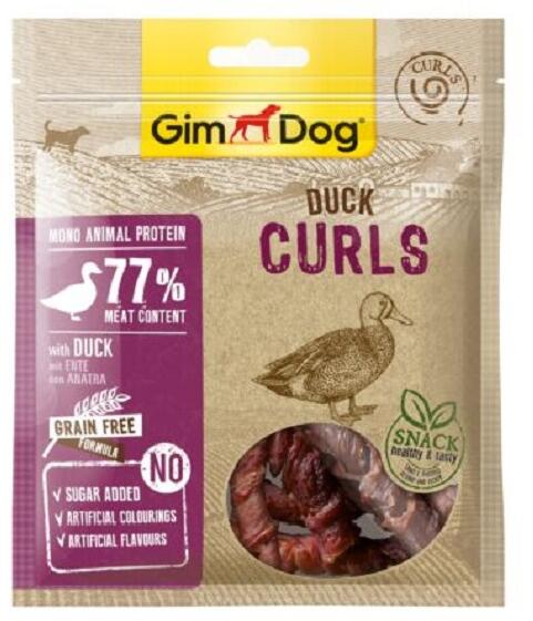 Jellemzők: GimDog Duck Curls fagyasztva és levegőn szárított filé, válogatott kacsából, kiváló minőségű és könnyen emészthető, fehérjében gazdag és gabonamentes recept alapján készül. Csak egyetlen állati fehérjeforrást használunk ezekhez a finom falatokhoz. - Monoprotein - Géntechnológia nélkül előállított termék - Levegőn szárított - Fagyasztva szárított