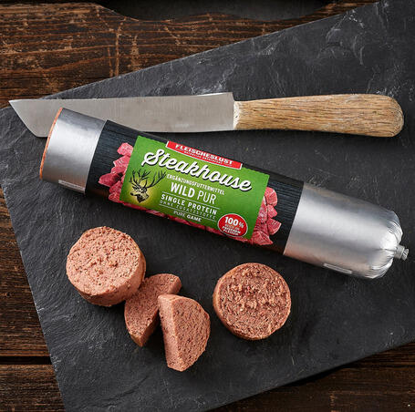 4.2kg Gluténmentes, alacsony hőmérsékleten, gőzölési eljárással készülő húsrolád antibiotikummentes húsokból. Egy féle állati fehérjét tartalmaz, szobahőmérsékleten tárolható, nyaralásokhoz is ideális. Csak vadhús és nyúlmáj, más semmi! Vaddisznót nem tartalmaz!