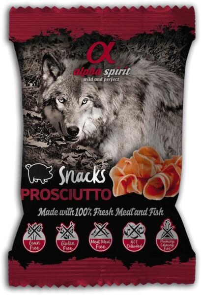 ALPHA SPIRIT SNACKS ● PROSCIUTTO SONKÁS JUTALOMFALAT KUTYÁKNAK - 50GHiszen egy vérbeli gazdinál mindig van néhány jutalomfalat! Az Alpha Spirit Snacks prosciutto sonkás falatkáival bármikor elcsábíthatod kedvenced. Csakis természetes összetevőkből készül és pompásan zamatos - ennek egyszerűen nem lehet ellenállni!Tréningek, trükkök vagy kutyasuli? A kis adagoknak hála k