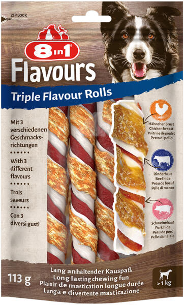 A zooplus. hu kínálatából: A csodaszép Svájcban nemcsak az embereknek számára készül fantasztikus csokoládé, hanem a kutyáknak is mesésen finom rágósnackeket állítanak elő. Ez tökéletesen igaz a 8in1 Triple Flavor Rolls rágórudakra is, melyek a legkiválóbb rágásélményt kínálják az Ön kedvencének is. Amúgy mellékesen ez a csemege még négylábú barátja foghigi