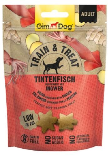 Jellemzők: – A GimDog Train & Treat snack ideális kutyák tanítására és jutalmazására. – A gyömbérrel finomított tintahal értékes és alternatív fehérjeforrása egyedülálló és fantasztikus íze elvarázsolja kutyáját. – A recept gabonamentes, hozzáadott cukrok, színezékek és mesterséges aromák nélkül. – Alacsony zsírtartalmú. Használat: A snack egészben