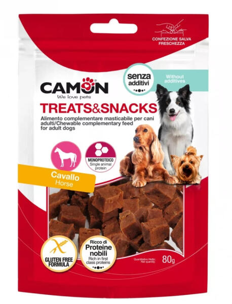 Monoproteines lovas kockák. Nettó súly: 80 gramm. Adalék és gluténmentes értendkiegészítő kutyák számára. ÖSSZETÉTEL: lóhús 78%, állati melléktermékek (ló) 12%, szójafehérje koncentrátum, (növényi) glicerin, szorbit, nátrium-klorid. ANALITIKAI ÖSSZETEVŐK: Nyersfehérje 39,3% - Nyersrost 1,0% - Nyerszsír 7,5% - Nyershamu 4,2% - Nedvesség 16,6%. HASZNÁLATI UTASÍTÁS: