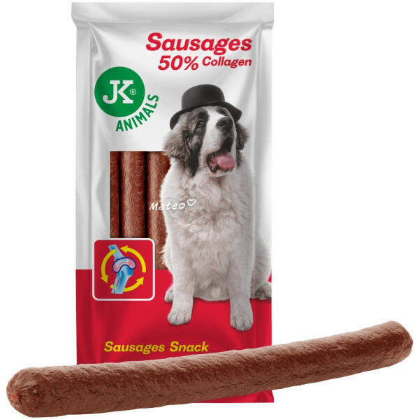 min vásárolható 1csomag ami 6db 30cm kolbász JK kolbász kutyáknak 50% kollagén és magyaros ízesítéssel 6db/30cm -jutalomként, kis darabokra adagolva -biztosítson az állat számára az ivóvízhez való hozzáférést. -Ajánlott felügyelet mellett adni Összetétel: hús és állati származékok (ebből kollagén 50%), gabonafélék, növényi eredetű származékok, olajok és zs