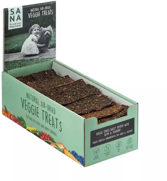 Kimért termék, az ár egy darab rúdra vonatkozik! A Veggie Strips rágcsák úgy néznek ki, mint a hús, ugyanolyan finom ízűek, de kizárólag egészséges édesburgonyából készülnek. Még ha kutyusod általában nem is szereti a zöldségeket, imádni fogja ezeket a vegán édesburgonya csíkokat. A gondosan válogatott édesburgonyát helyben szerzik be. A SANA kíméletes gyártási